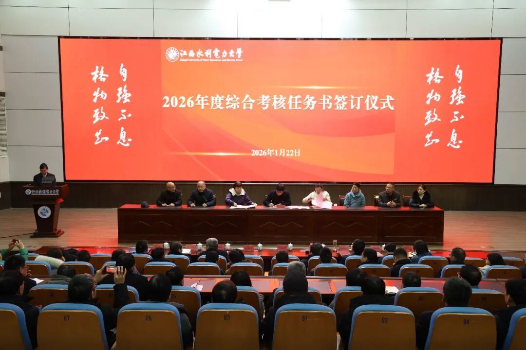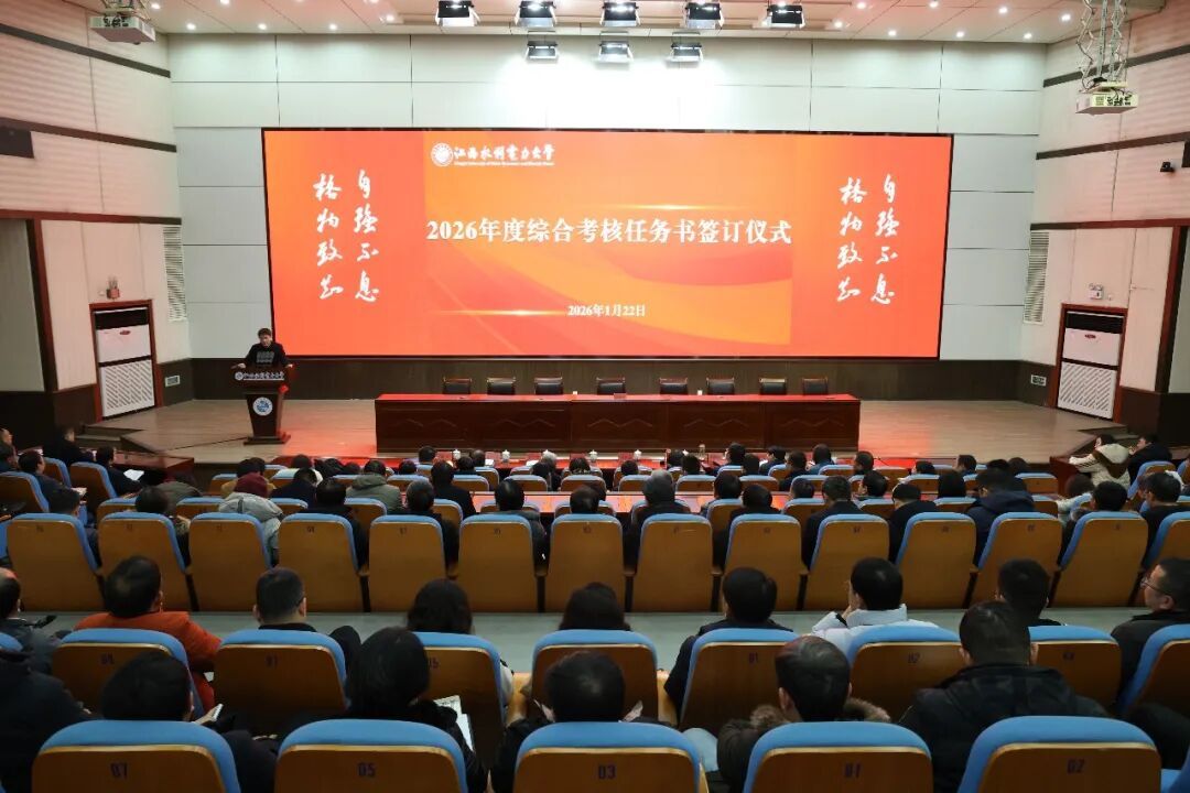 1月22日,学校在大禹学术报告厅举行二级单位(部门)2026年度综合考核任务书签订仪式。校长刘林芽出席、与各二级单位(部门)签订2026年度综合考核任务书并讲话,校党委副书记吴泽俊主持,在家校领导和副处级以上干部参加。